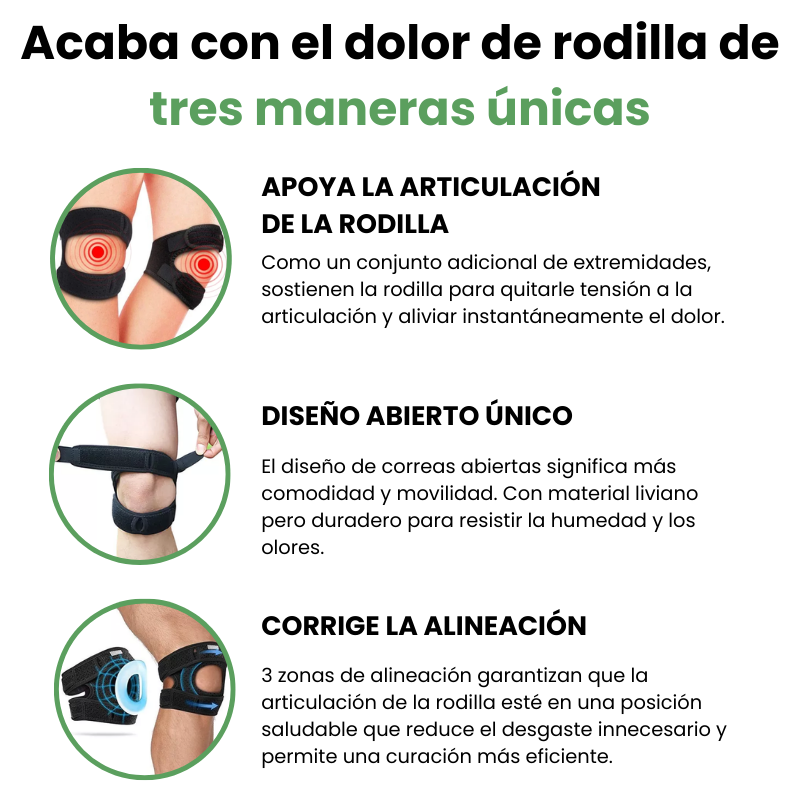 Son aparatos ortopédicos que utilizan tecnología de zonas de alineación. Con bandas de soporte especializadas para alinear los músculos y las articulaciones que rodean la rodilla, el alivio del dolor es casi instantáneo. El aparato ortopédico ofrece una compresión ajustable, que promueve el flujo sanguíneo en la región de la rodilla para una curación más rápida.