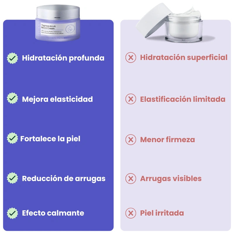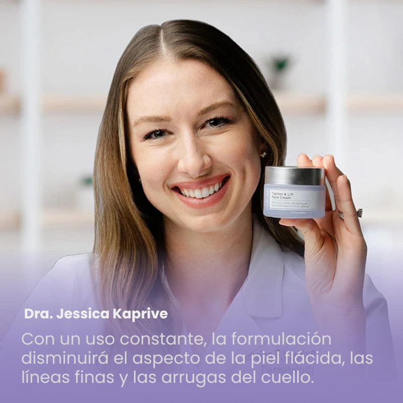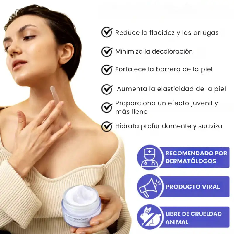 Nuestra crema para el cuello hidrata profundamente, mejora la elasticidad y reafirma la piel flácida, suavizando la textura arrugada. Con su fórmula única, notarás una apariencia más juvenil y tersa en solo unas semanas.