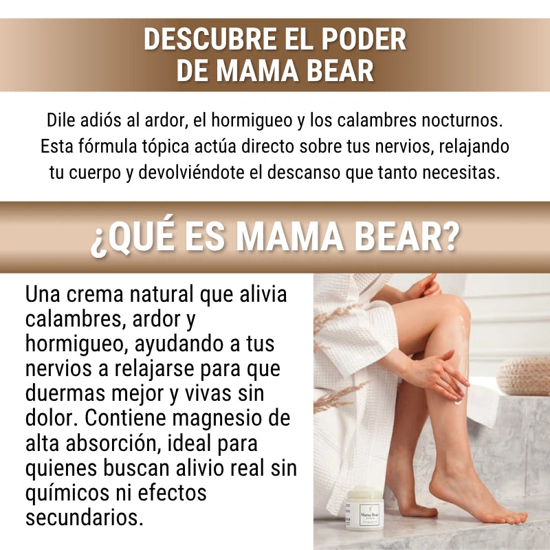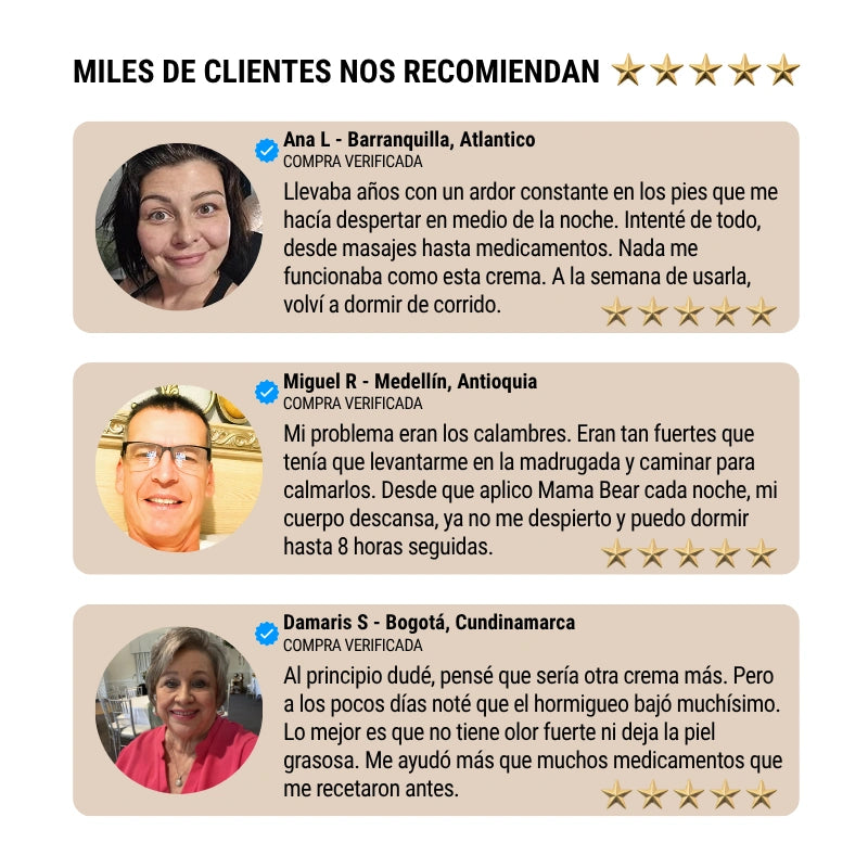 “Llevaba meses sin dormir bien por culpa del ardor en las piernas. Desde que uso Mama Bear, descanso profundamente y despierto con energía. Es increíble cómo algo tan simple puede hacer tanta diferencia. ¡No lo dejo por nada!”
