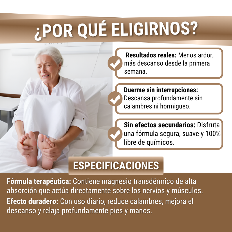 “Tenía años con calambres nocturnos que me despertaban gritando. Probé la loción sin mucha fe… pero me sorprendió. La primera noche ya dormí mejor, y a la semana, ¡ni un solo calambre más! Ahora puedo levantarme sin miedo.”