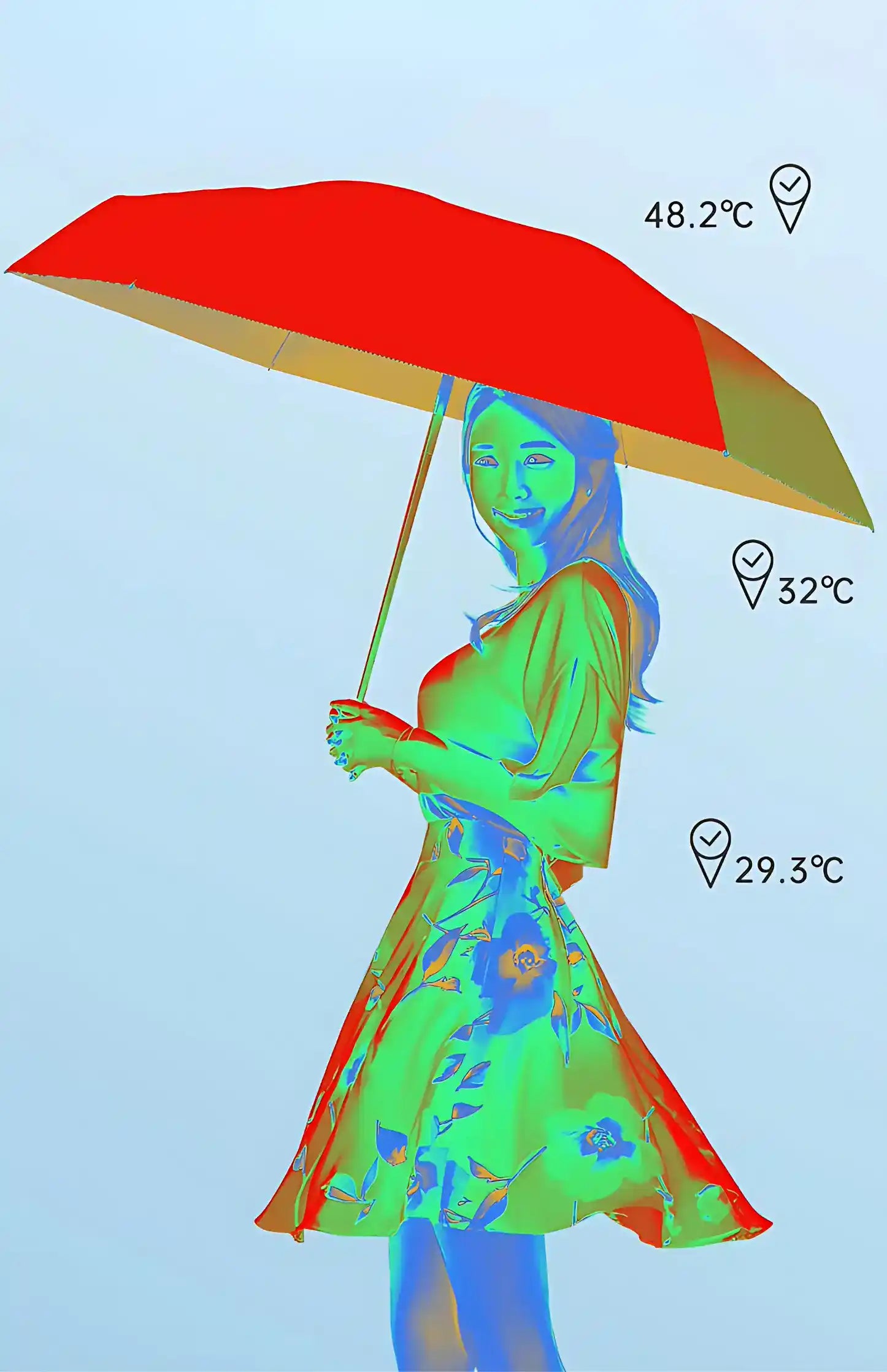 El recubrimiento protector aísla eficazmente del calor, lo que hace que la sensación de temperatura bajo el paraguas disminuya significativamente, manteniéndote fresco en los días más calurosos.