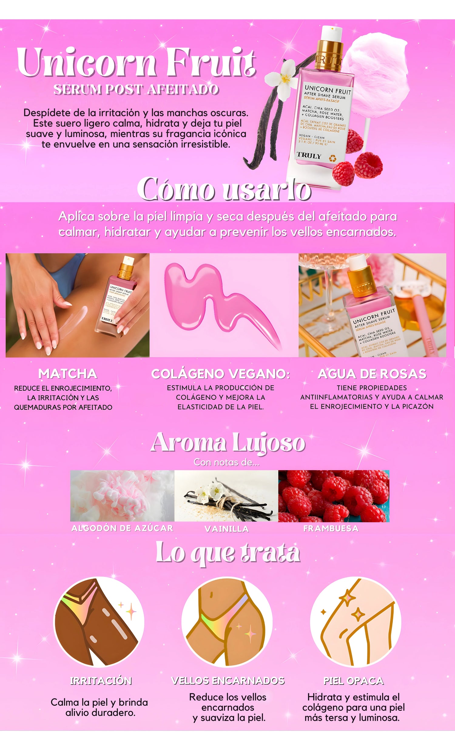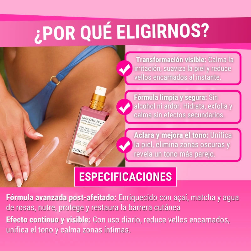 "Me ardía, me picaba, y ni hablar del enrojecimiento. Me daba hasta miedo depilarme. Desde que uso Unicorn Fruit, mi piel está suave, clara y sin dolor. Es el único producto que me entiende de verdad."